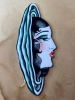 Hand made with porcelain slab - wall plaque measuring 22cm wide by 9.5.cm tall. Hand painted with underglaze with an added mother of pearl lustred tear drop. This plaque has two recessed holes for hanging.